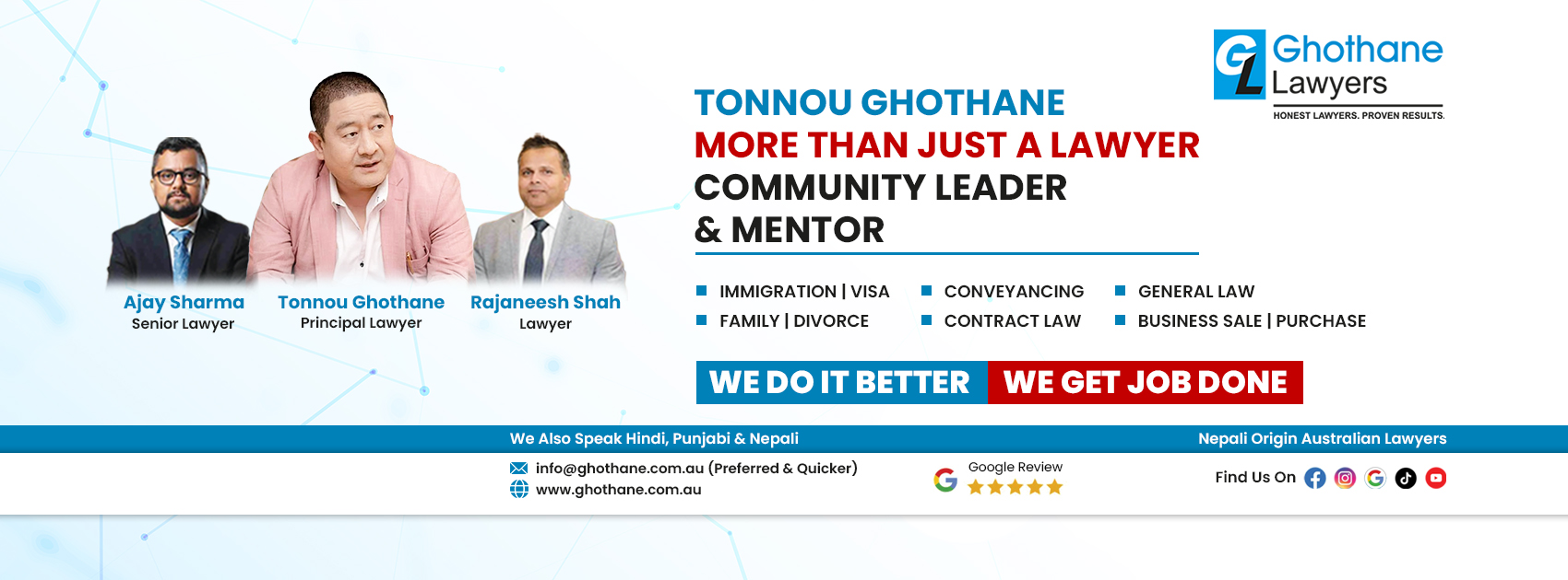 Ghothane Lawyers are the best migration lawyers in Melbourne. I have been granted with SC 482 visa today moving from temporary SC 407 and I am extremely satisfied! I was unsure about the steps but Ajay Sharma ( expert TWGG lawyer) and TWGG team handled my case very professionally, efficiently and actively from the beginning to the end made it simple and successful. Thank you Ghothane lawyers and Team!!